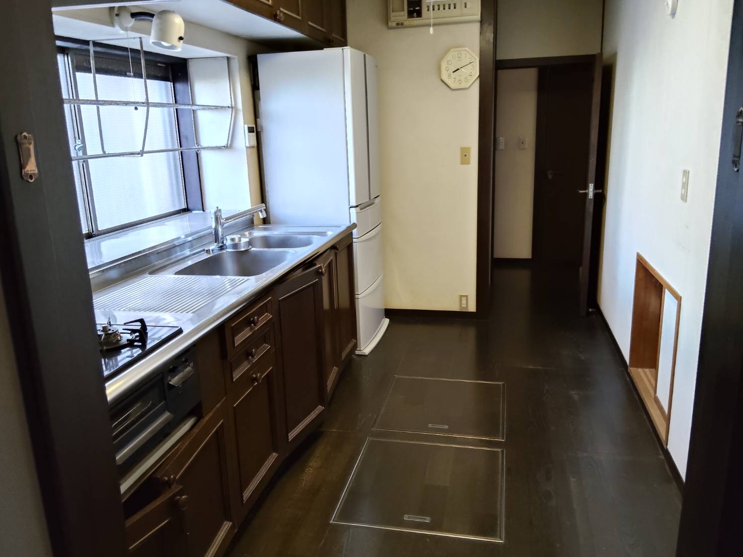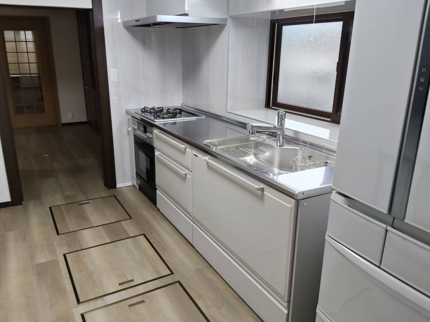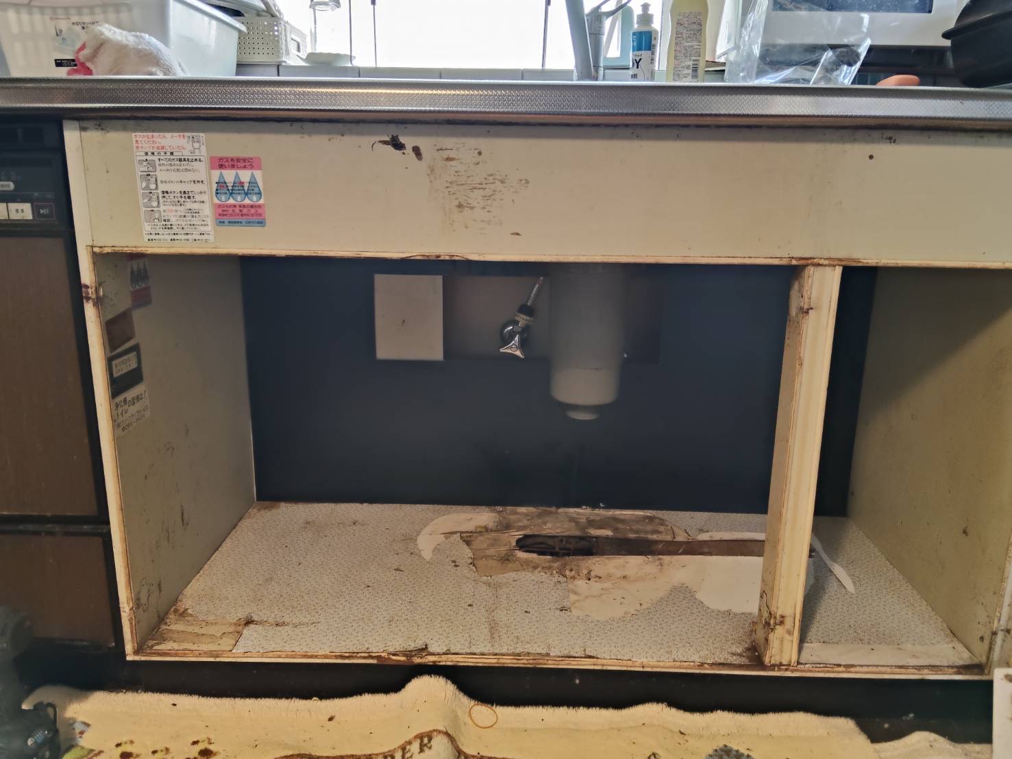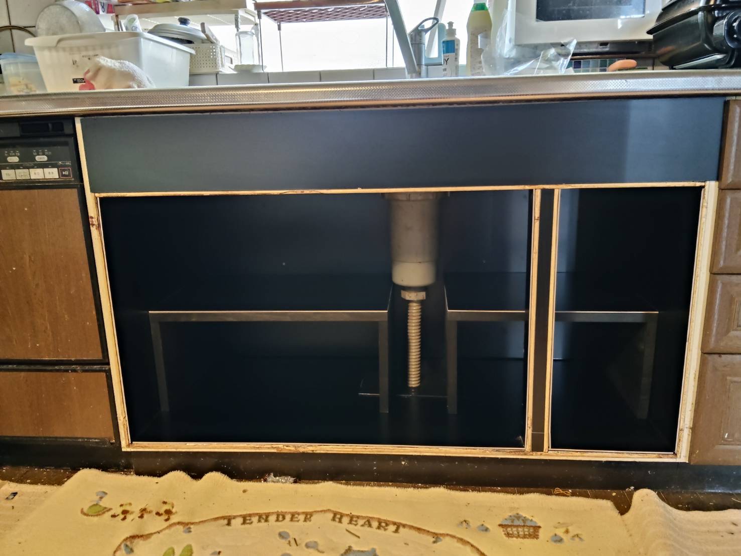 40年前のキッチン収納 腐食が進んでいた為、耐久性や耐水性に優れたキッチンパネルを貼り、棚を設置。 扉を外して物が取り出しやすいように施工しました。